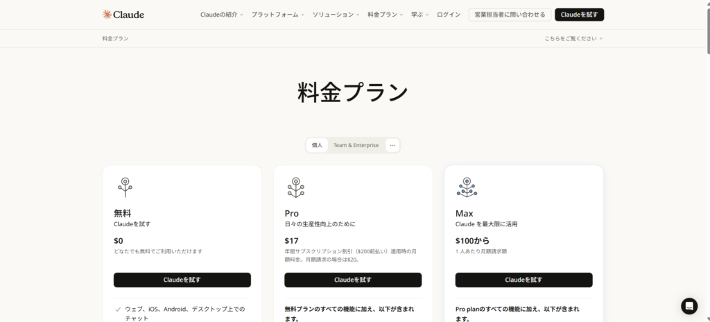 | Max 5x | $100/月 | Proの5倍の使用量 |