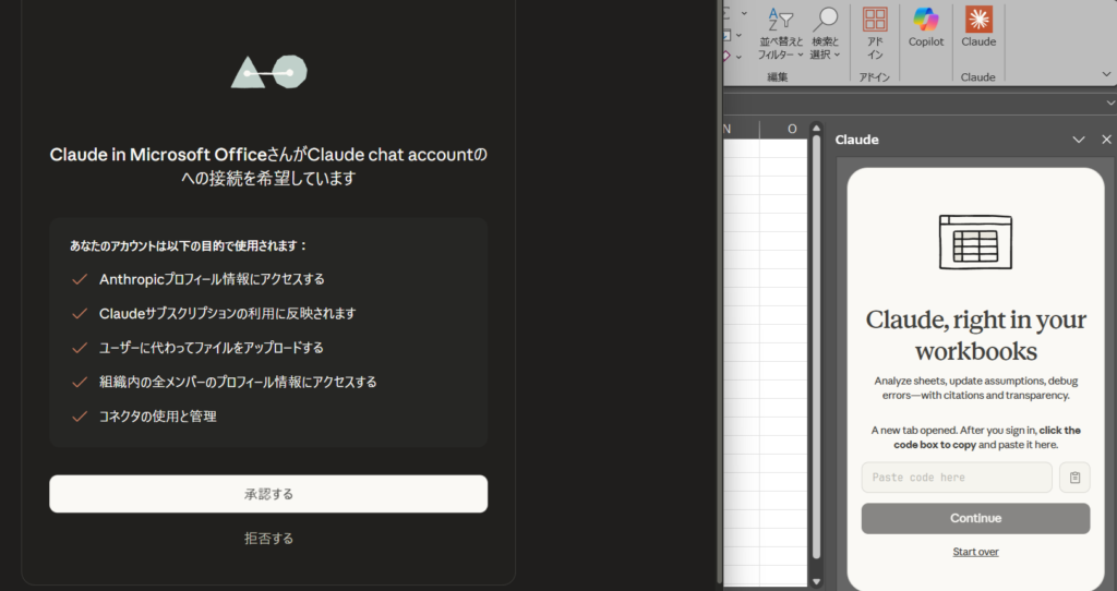 ステップ3 : Excelを開き、ホームリボンからClaudeを起動してサインインする